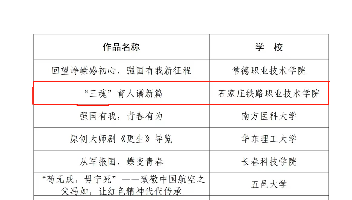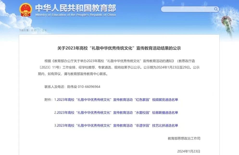 近日,教育部公示2023年高?!岸Y敬中華優(yōu)秀傳統(tǒng)文化”宣傳教育活動(dòng)結(jié)果,學(xué)院選送作品《“三魂”育人譜新篇》入選“紅色家園”視頻展覽遴選名單。